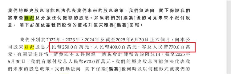 招股书显示,蔓迪国际分别于2022年、2023年、2024年及截至2025年6月30日止六个月,向本公司股东宣派股息2.50亿元、4亿元、0元及人民币7.70亿元,累计分红约14.2亿元。