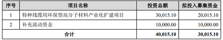 此次,太湖远大拟募集资金约3亿元,其中1亿元用于补充流动资金,其余资金投向特种线缆用环保型高分子材料产业化扩建项目。