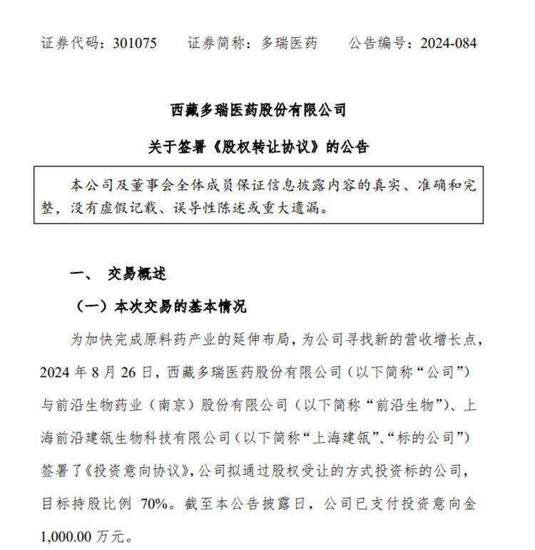 10月11日,多瑞医药发布公告披露,为加快完成原料药产业的延伸布局,为公司寻找新的营收增长点,2024年8月26日,多瑞医药与前沿生物药业(南京)股份有限公司(以下简称“前沿生物”)、上海前沿建瓴生物科技有限公司(以下简称“上海建瓴”、“标的公司”)签署了《投资意向协议》,多瑞医药拟通过股权受让的方式投资标的公司,目标持股比例70%。截至该公告披露日,该公司已支付投资意向金1,000.00万元。