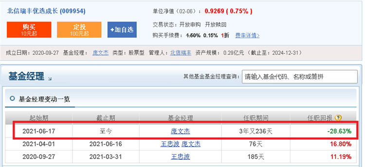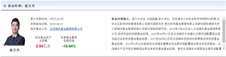 作为四星级基金经理的庞文杰,累计任职时间4年又252天,现任基金资产规模2.04亿(3只基金),其中管理的北信瑞丰优选成长,自2021年6月17日任职至今,任期3年又236天内回报率仅-28.63%。