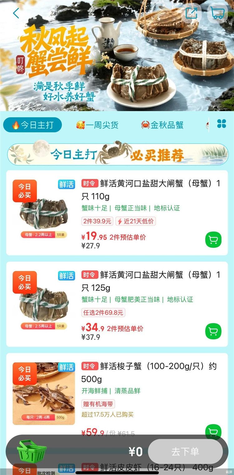 作为聚会宴席上的“重头戏”,大闸蟹一直是电商平台紧抓的流量品类。多个电商平台已推出大闸蟹消费专区来吸引用户购买,促销蟹卡、大闸蟹礼盒。以叮咚买菜为例,消费者购买两只鲜活黄河口盐田大闸蟹(母蟹)可享优惠,阳澄湖大闸蟹蟹卡则降价11—111元不等。