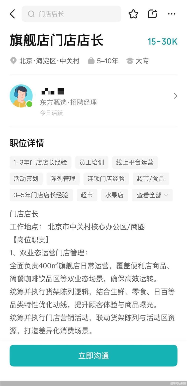 东方甄选为线下门店招兵买马。招聘网站显示,东方甄选对店长的资质有较高要求。店长需要有5年以上零售行业的工作经历,有着管理“餐饮+零售”复合业态的经验。公司会优先考虑便利蜂、711、罗森等连锁便利店从业经验的人士,带过超15人以上的团队。