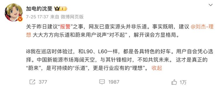 他还提到“我觉得沈斐的建议特别好,请理想公司真正通过法律途径解决问题,尽快报警。”