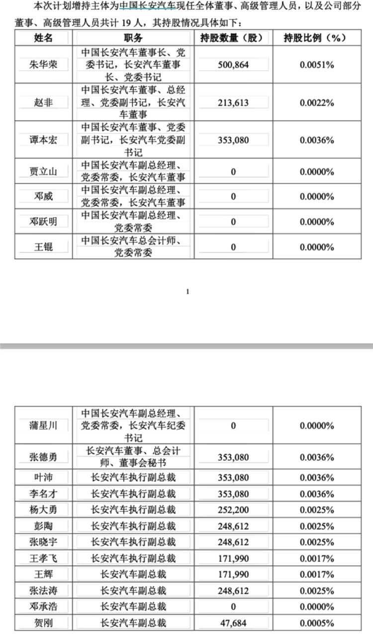 公告显示,本次计划增持主体为中国长安汽车现任全体董事、高级管理人员,以及公司部分董事、高级管理人员共计19人。