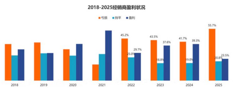 3月18日,中国汽车流通协会发布《2025年全国汽车经销商生存状况调查报告》(下称《调查报告》)并指出,2025年汽车经销商普遍未能完成全年销量目标,价格倒挂持续,新车业务亏损加剧,汽车经销商亏损面增加,盈利面收窄。