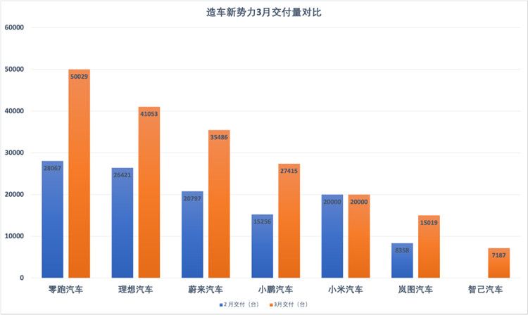 4月1日,多家造车新势力先后披露了3月交付数据,整体来看回暖趋势明显,除小米汽车外,各家造车新势力3月交付量均大幅好于2月。就车企来看,零跑汽车环比大幅增长,重新迈过5万辆门槛。理想汽车、蔚来汽车也有明显上涨,月销量分别超过4万辆和3万辆。