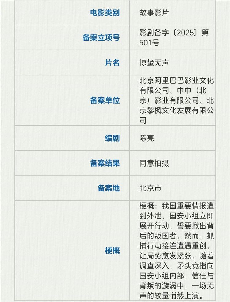 北京阿里巴巴影业、中中(北京)影业、北京黎枫文化一起备案了陈亮编剧的《惊蛰无声》,故事讲的是我国重要情报遭到外泄,国安小组立即展开行动,誓要揪出背后的叛国者。然而,抓捕行动接连遭遇重创,让局势愈发紧张。随着调查深入,矛头竟指向国安小组内部,信任与背叛的漩涡中,一场无声的较量悄然上演。