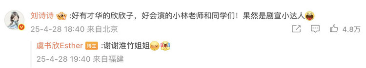 4月28日,刘诗诗主演的电视剧《淮水竹亭》上线,虞书欣发文帮忙宣传。对此,刘诗诗回复虞书欣cos东方淮竹:“好有才华的欣欣子,好会演的小林老师和同学们!果然是剧宣小达人”。欣欣回复:“谢谢淮竹姐姐!”俩人还互关。