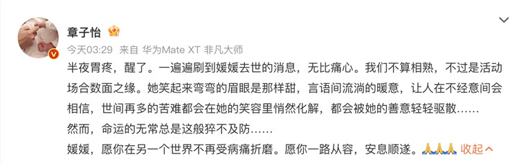 5月22日凌晨,章子怡发文悼念朱媛媛,称一遍遍刷到朱媛媛去世的消息,无比痛心。