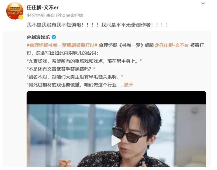 近日,《书卷一梦》剧中一段经纪人台词因高度还原娱乐圈现实问题引发热议,编剧也被质疑影射内娱乱象。随后,《书卷一梦》编剧发文回应内娱味儿十足的台词:“我不是我没有我不知道哦!!!!我只是平平无奇创作者!!!!”