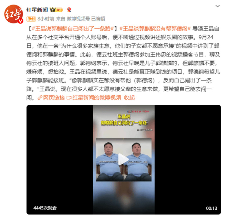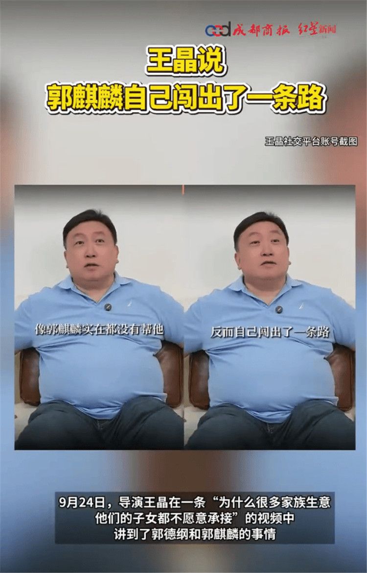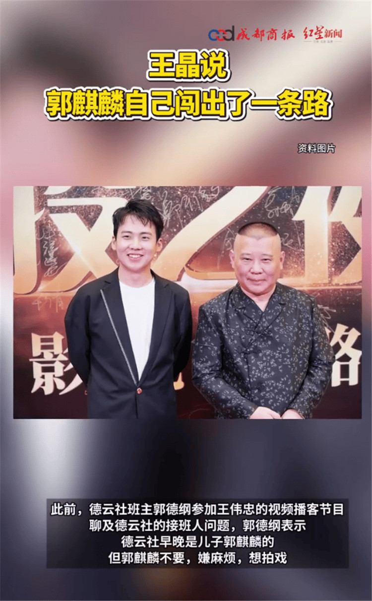 导演王晶自从在多个社交平台开通个人账号后,便不断通过视频讲述娱乐圈的故事。9月24日,他在一条“为什么很多家族生意,他们的子女都不愿意承接”的视频中讲到了郭德纲和郭麒麟的事情。此前,德云社班主郭德纲参加王伟忠的视频播客节目,聊及德云社的接班人问题,郭德纲表示,德云社早晚是儿子郭麒麟的,但郭麒麟不要,嫌麻烦,想拍戏。