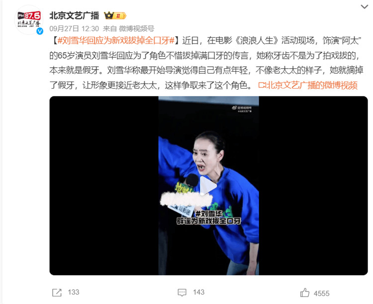 近日,在电影《浪浪人生》活动现场,饰演“阿太”的65岁演员刘雪华回应为了角色不惜拔掉满口牙的传言,她称牙齿不是为了拍戏拔的,本来就是假牙。刘雪华称最开始导演觉得自己有点年轻,不像老太太的样子,她就摘掉了假牙,让形象更接近老太太,这样争取来了这个角色。