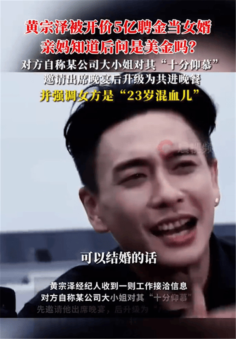 近日,黄宗泽在香港出席品牌活动时,自曝近期一场戏剧性的“天价邀约”事件,黄宗泽经纪人收到一则工作接洽信息,对方自称某公司大小姐对其“十分仰慕”,先邀请他出席晚宴,后升级为“共进晚餐”,最终提出若答应结婚,将支付5亿元聘金,并强调女方是“23岁混血儿”。