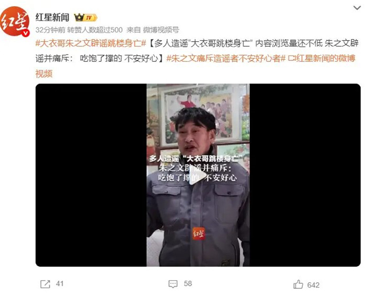 近日,多人造谣“大衣哥跳楼身亡” 的消息,其内容浏览量还不低。对此,“大衣哥”朱之文辟谣,称自己正在正常进行演出,并痛斥造谣者:“吃饱了撑的!不安好心。”