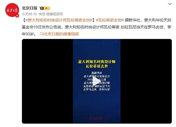 据新华社,意大利华伦天奴基金会19日发布公告说,意大利知名时尚设计师瓦伦蒂诺·加拉瓦尼当天在罗马去世,享年93岁。