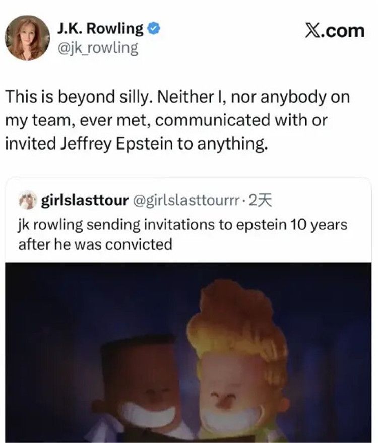 近日,有网友指称JK罗琳邀请爱泼斯坦参加《哈利·波特与被诅咒的孩子》的演出活动,对此,罗琳强烈否认:“荒谬至极。我和我的团队成员从未见过杰弗里·爱泼斯坦,从未与他联系过,也从未邀请他参加任何活动。”