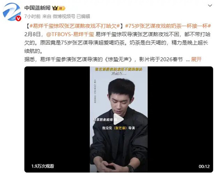 2月8日,易烊千玺惊叹导演张艺谋熬夜戏不困,都不带打哈欠的,“精力实在是太旺盛了”。原因竟是75岁张艺谋导演超爱喝奶茶。奶茶是白天喝的,精力是晚上超长续航的。