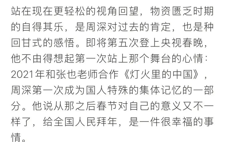 近日,歌手周深在接受杂志采访时回忆第一次登上春晚的心情,表示从那以后春节对自己的意义又不一样了,给全国人民拜年是件很幸福的事,此外他还表示觉得这十年间自己最大的变化是有安全感了,话也变多了,很感谢和珍惜粉丝。