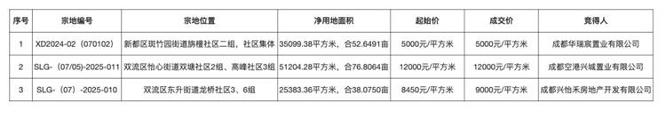 此次出让的另两宗地块均底价成交。新都区地块的位置为新都区斑竹园街道旃檀社区二组、社区集体,土地出让面积35099.38平方米(合52.6491亩),规划建筑面积87748平方米,起拍楼面价5000元/平方米,起始价约4.39亿元。该地块由成都华瑞宸置业有限公司以底价竞得。