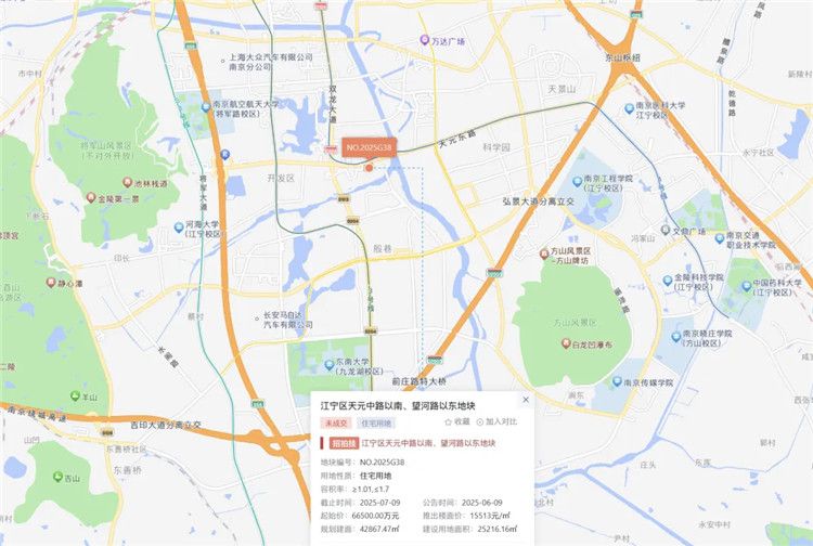 7月9日,江苏省南京市成交一宗住宅地块,编号为NO.2025G38的江宁区天元中路以南、望河路以东地块。经过33轮竞价,常州本土房企嘉宏集团旗下的常州嘉宏房地产开发有限公司以7.29亿元的总价竞得,成交楼板价17006元/平方米,溢价率9.62%。