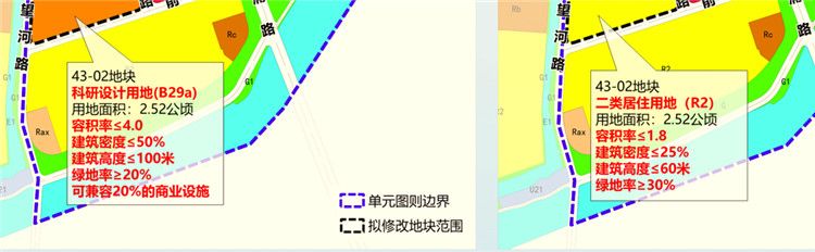 此前,43-02地块规划为科研设计用地,可兼容20%的商业设施;拟调整为二类居住用地,容积率≤1.8。