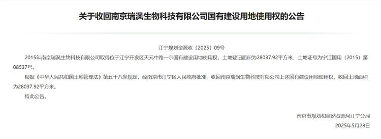 另据南京市规划和自然资源局江宁分局今年5月28日的公告,2015年南京瑞沨生物科技有限公司取得位于江宁开发区天元中路的科研用地,土地登记面积为28037.92平方米,土地证号为宁江国用(2015)第08537号。根据《中华人民共和国土地管理法》第五十八条规定,经南京市江宁区人民政府批准,收回上述国有建设用地使用权,收回土地面积为28037.92平方米。南京瑞沨公司的股东为江苏景枫控股集团有限公司,自然人张景春持股90%。
