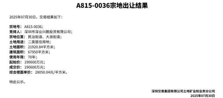 根据地块信息,此次出让地块宗地号为A815-0036,地块位于龙华区大浪与民治街道交会处,土地用途为二类居住用地,土地出让面积21920.84平方米,规划建筑面积67950平方米,容积率3.1,地块起始价为19.06亿元。