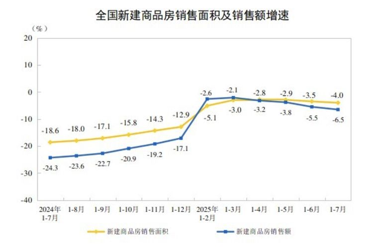 国家统计局数据显示,1—7月份,全国新建商品房销售面积51560万平方米,同比下降4.0%,降幅比去年同期收窄14.6个百分点,但较1-6月扩大0.5个百分点;其中住宅销售面积下降4.1%。新建商品房销售额49566亿元,下降6.5%;其中住宅销售额下降6.2%。