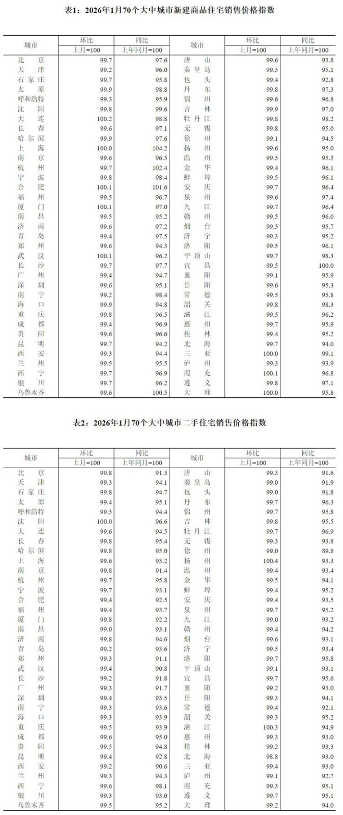 2月13日,国家统计局发布2026年1月份70个大中城市商品住宅销售价格变动情况。数据显示,今年1月,70个大中城市商品住宅销售价格环比降幅总体收窄、同比下降,其中,一线城市二手房降幅收窄幅度最大,此外二手房市场结束连续4个月零上涨城市局面。