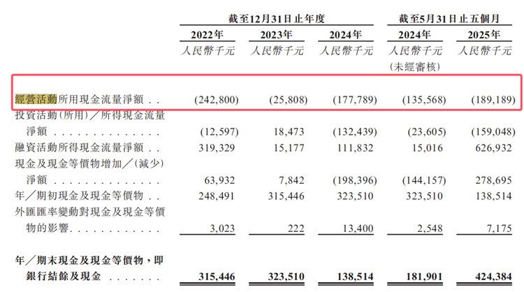 2022年至2024年及2025年前五个月,该公司经营活动所用现金流净额分别为-2.43亿元、-2580.8万元、-1.78亿元、-1.89亿元。
