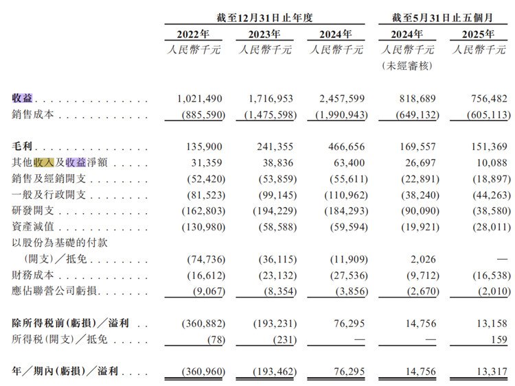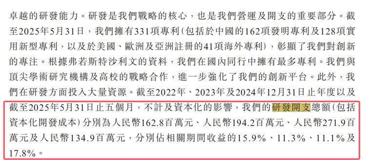 2022年至2024年及2025年前五个月,飞骧科技的研发开支总额分别为1.63亿元、1.94亿元、2.72亿元、1.35亿元,分别占相关期间收益的15.9%、11.3%、11.1%、17.8%。