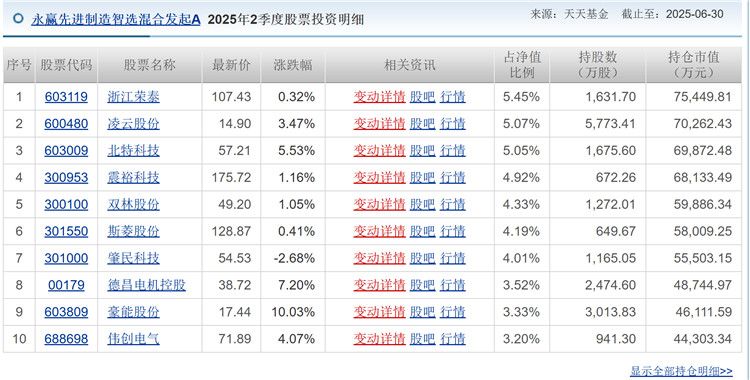 2025年2季度,永赢先进制造A持股前十的股票为浙江荣泰、凌云股份、北特科技、震裕科技、双林股份、斯菱股份、肇民科技、德昌电机控股、豪能股份、伟创电气,前十持仓占比合计43.07%。