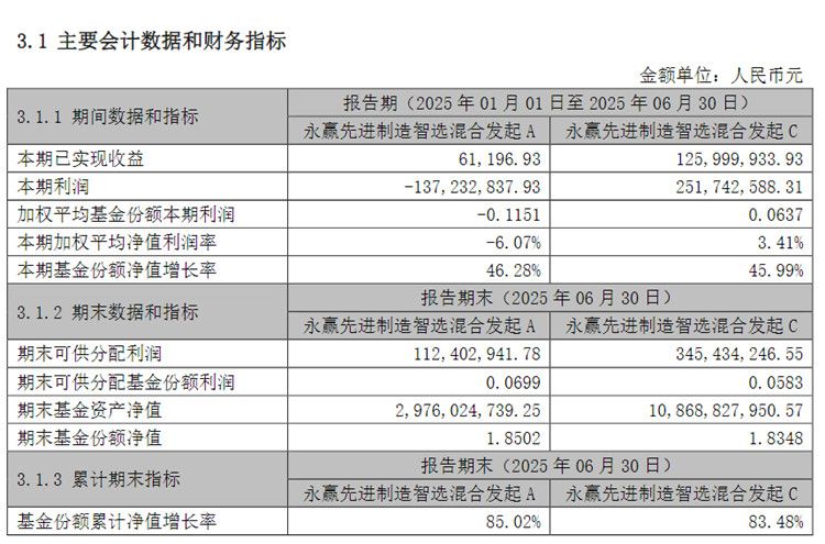 今年上半年,永赢先进制造智选混合发起A (018124,以下称永赢先进制造A)以46.28%的基金份额净值增长率在主动权益基金中排名领先。然而,在这份看似辉煌的成绩单背后,永赢先进制造智选混合型发起式证券投资基金中报却显示了另一个事实:上半年该基A类份额利润为-1.37亿元。相比之下,该基金C类份额的利润是2.52亿元,两类份额差异巨大。