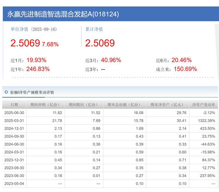 截至2025年6月30日,永赢先进制造A的期末净资产为29.76亿元,变动率为-2.12%。
