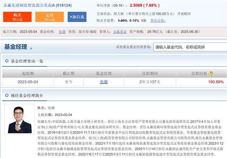 永赢先进制造A的基金经理为张璐,履历显示,张璐海交通大学硕士研究生。曾任上海东方证券资产管理有限公司量化投资部研究员,2017年4月加入华泰证券(上海)资产管理有限公司,任基金量化部资深研究员、基金经理。曾任永赢低碳环保智选混合型发起式证券投资基金基金经理。2019年8月2日至2020年11月13日担任华泰紫金中证红利低波动指数型发起式证券投资基金、华泰紫金智能量化股票型发起式证券投资基金基金经理。锐方(上海)投资管理有限公司投资经理,永赢基金管理有限公司投资经理,现任永赢基金管理有限公司指数与量化投资部基金经理。2022年7月15日起任永赢高端装备智选混合型发起式证券投资基金基金经理,2023年12月5日起担任永赢卓越臻选股票型发起式证券投资基金基金经理。2025年1月14日担任永赢国证通用航空产业交易型开放式指数证券投资基金基金经理。2022年6月17日至2025年3月11日担任永赢新能源智选混合型发起式证券投资基金基金经理。