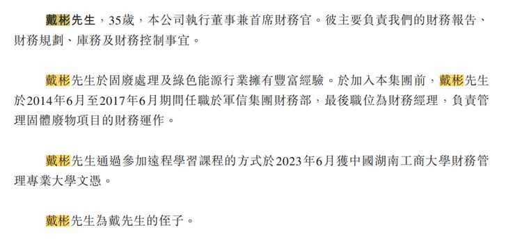 相关媒体报道称招股书披露,军信股份的执行董事兼首席财务官是公司实控人戴道国的侄子戴彬。2014年6月至2017年6月期间,戴彬曾任职于军信集团财务部,最后职位为财务经理;2022年11月,成为军信股份财务总监,2025年1月升任董事。2023年6月,戴彬才通过参加远程学习课程的方式获得湖南工商大学财务管理专业大学文凭。