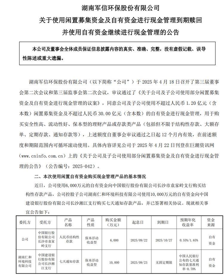 公告显示,军信股份于 2025 年4 月18 日召开了第三届董事会第二次会议和第三届监事会第二次会议,审议通过了《关于公司及子公司使用部分闲置募集资金及自有资金进行现金管理的议案》,同意公司及子公司使用不超过人民币1.20亿元闲置募集资金及不超过人民币 30 亿元的自有资金进行现金管理,用于购买安全性高、流动性好、保本型的理财产品或存款类产品(包括但不限于结构性存款、大额存单、定期存款、通知存款等),上述额度自董事会审议通过之日起12 个月内有效,在前述额度和期限范围内可循环滚动使用。