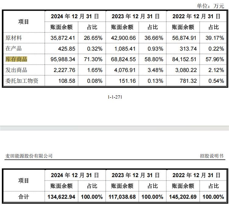 而且,麦田能源的存货中的库存商品占比超过七成。报告期各期末,该公司的存货账面价值分别为143,947.42万元、110,401.82万元和123,492.93万元,占流动资产的比例分别为39.10%、31.54%和28.29%。