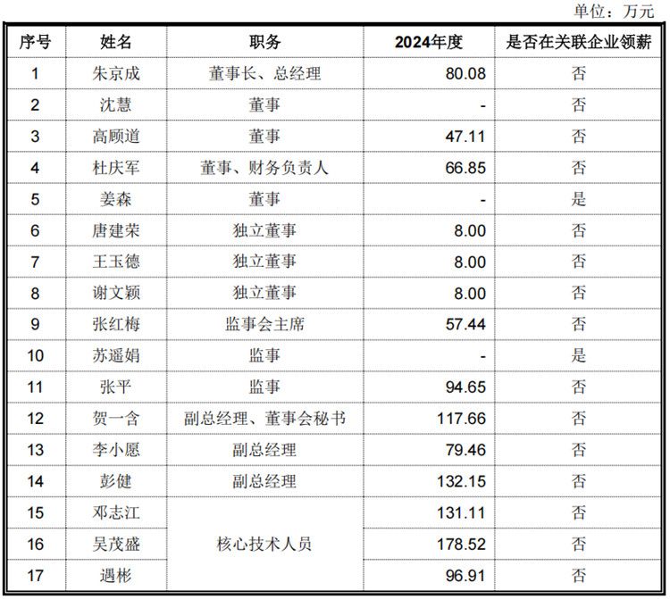具体而言,2024年麦田能源的副总经理、董事会秘书贺一含的薪酬为117.66万元,副总经理的彭健的薪酬132.15万元,核心技术人员邓志江的薪酬为131.11万元,吴茂盛的薪酬为178.52万元。上述四位高管及核心技术人员的薪酬合计559.44万元。