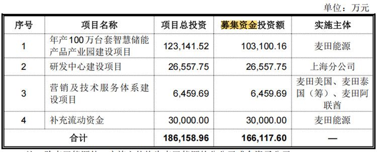 招股书显示,此次IPO,麦田能源计划募集资金16.6亿元,其中10.3亿元用于年产100万台套智慧储能产品产业园建设项目,2.66亿元用于研发中心建设项目,0.65亿元用于营销及技术服务体系建设项目,3亿元用于补充流动资金。