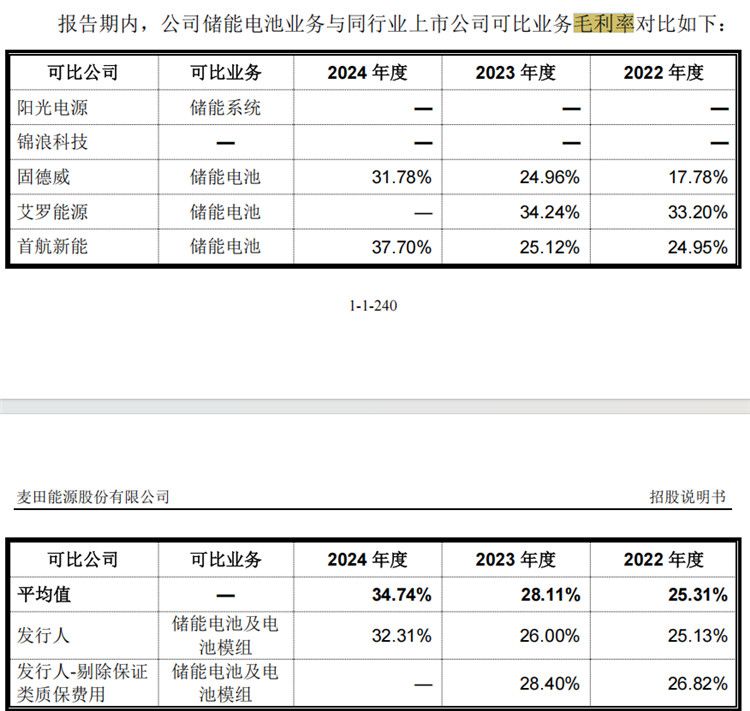 报告期内,麦田能源的储能电池及电池模组的毛利率分别为25.13%、26%和32.31%,同期行业可比均值分别为25.31%、28.11%和34.74%。尽管麦田能源在该产品上的毛利率在上升,但低于同行可比毛利率均值。