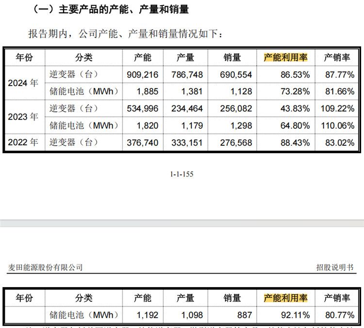 但值得注意的是,上述100台套智慧储能产品中的一些产品的产能利用率并不高。从2022年至2024年(以下简称报告期),麦田能源的逆变器的产能利用率分别为88.43%、43.83%和86.53%,储能电池的产能利用率分别为92.11%、64.8%和73.28%。可见,麦田能源的产能利用率出现了下滑且仍没有恢复到之前水平。