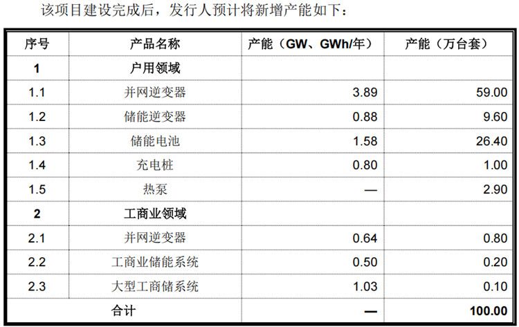 此次募资的“100台套智慧储能产品”包括59万套并网逆变器,9.6万套储能逆变器,26.4万储能电池,1万套充电桩,2.9万套热泵,0.8万套并网逆变器,0.2万套工商业储能系统,0.1万套大型工商储系统。