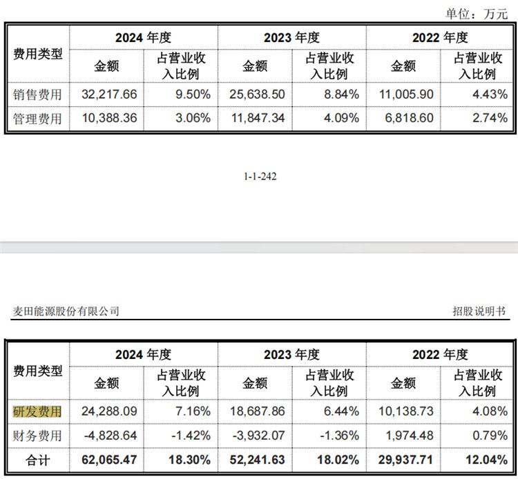 麦田能源的研发费用率低于其销售费用率。报告期内,该公司的研发费用分别为1.01亿元、1.87亿元和2.43亿元,同期研发费用率分别为4.08%、6.44%和7.16%;同期,麦田能源的销售费用分别为1.1亿元、2.56亿元和3.22亿元,同期销售费用率分别为4.43%、8.84%和9.5%。