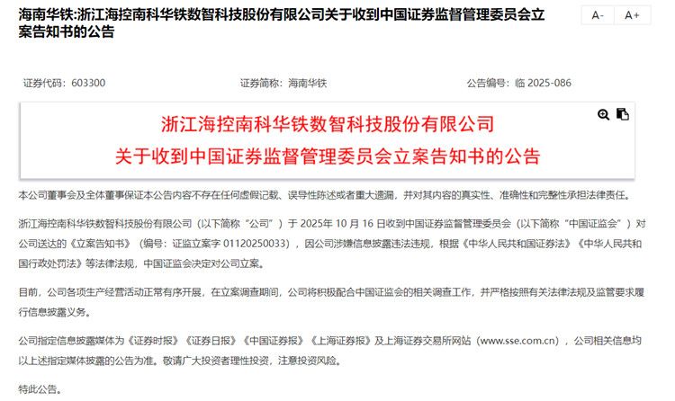 近日,海南华铁又发布公告称,公司于2025年 10 月 16 日收到证监会对公司送达的《立案告知书》,因公司涉嫌信息披露违法违规,根据《中华人民共和国证券法》《中华人民共和国行政处罚法》等法律法规,证监会决定对公司立案。