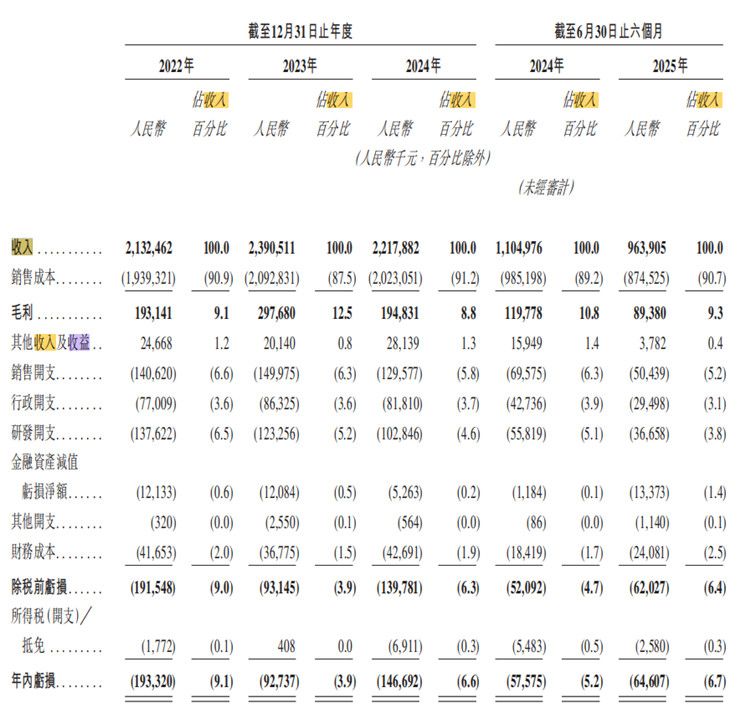 10月15日,白山云控股有限公司再次向联交所递交上市申请。招股书显示,2022年-2024年及2025年上半年,白山云的收入分别为21.32亿元、23.91亿元、22.18亿元、9.64亿元,经调整净亏损分别为1.66亿元、5368.1万元、1.14亿元及5462.9万元,累计净亏损约3.9亿元。