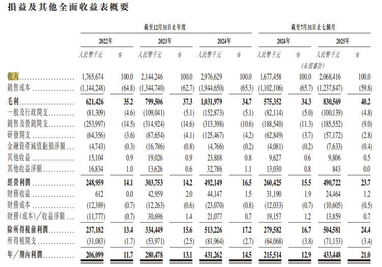 招股书显示,2022年-2024年及2025年1—7月(以下简称报告期),涛涛车业营收分别为17.66亿元、21.44亿元、29.77亿元、20.68亿元;净利润分别为2.06亿元、2.80亿元、4.31亿元、4.33亿元。另一方面,报告期内,涛涛车业的毛利率分别为35.2%、37.3%、34.7%、40.2%。