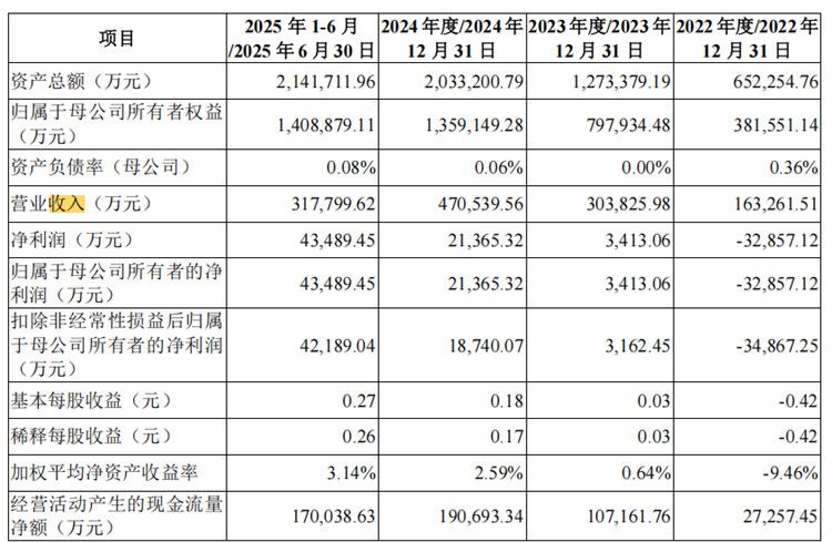 招股书显示,从2022年至2024年及2025年上半年(以下简称报告期),盛合晶微的营收分别约16.33亿元、30.38亿元、47.05亿元、31.78亿元;对应实现归属净利润分别约-3.29亿元、3413.06万元、2.14亿元、4.35亿元。