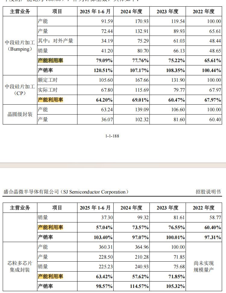 报告期内,盛合晶微中段硅片加工(Bumping)的产能利用率分别为65.61%、75.22%、77.76%、79.09%。2023年、2024年及2025年1-6月,盛合晶微芯粒多芯片集成封装产能利用率分别为71.85%、57.62%、63.42%。