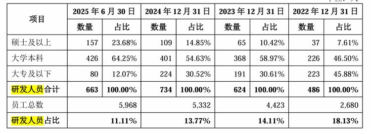 值得关注的是,2024年末,盛合晶微研发人员数量为734人,而2025年6月末,公司研发人员数量为663人,相较于去年末减少71人。
